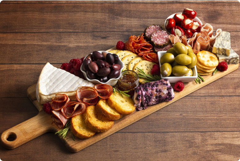 Bold & Briny Olive tapenade – salty, rich, and perfect with meats Whole grain mustard – adds punch to prosciutto and sharp cheddar Smoked salmon dip – indulgent and savory
